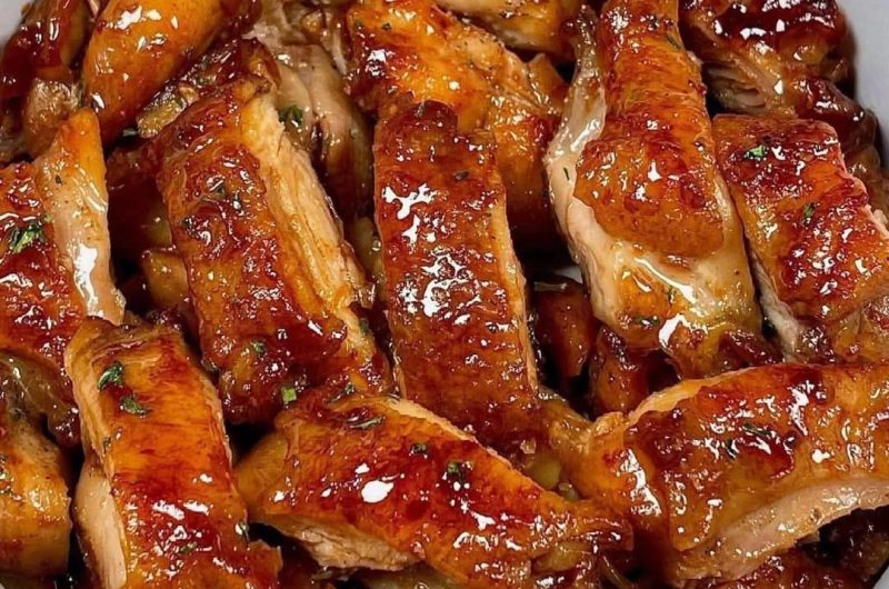 Return the chicken to the pan and toss in the glaze. Continue cooking for a few minutes, coating the chicken until it’s glossy and caramelized.